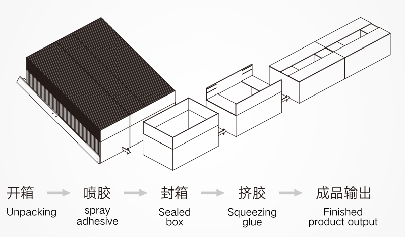 This machine is a specialized automatic box gluing machine for matching the top and bottom covers. Widely used in the automated production of transportation boxes for various fruits,vegetables, fresh produce, furniture, and hardware packaging.